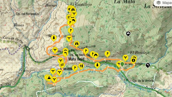 Así mismo ofrece la oportunidad de visitar vestigios del pasado, en forma del castillo de Mata Bejid y su era. El recorrido de esta ruta discurre íntegramente por sendero, más dos trocitos de carril, un pequeño tramo que te pasa por las ruinas del castillo y otro de 430 metros que es el que te acerca al área recreativa.